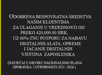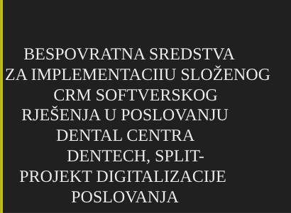 Našim klijentima, Dental centru Dentech iz Splita, odobrena je potpora EU fondova za implementaciju naprednog softverskog CRM rješenja u poslovanju, uz jačanje digitalnih vještina zaposlenika, kroz 60%-tno sufinanciranje bespovratnim sredstvima. Više na: http://www.aplikat28.hr/aktualno (Projekt 2023., digitalizacija poslovanja kroz NPOO)