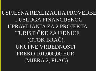 Novi primjer uspješne realizacije provedbe 2 projekata Turističke zajednice (otok Brač/2023.), financiranih u cijelosti bespovratnim sredstvima u vrijednosti preko 101.000,00 EUR. Tvrtka Aplikat 28 pružila je kompletne usluge financijskog upravljanja projektima, a našim klijentima na ovaj način odobrene su pozitivne odluke za isplatu i 100%-tno sufinanciranje aktivnosti TZ, kroz mjere 2 FLAG-a (www.aplikat28.hr/aktualno)